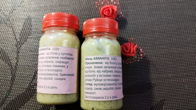 Склад: живокіст, сокирки, підмор, чорнобривці, оцет, тваринний жир, каштан, синяк, ін.. Застосування: запалення суглобів та м’язів, невралгія.