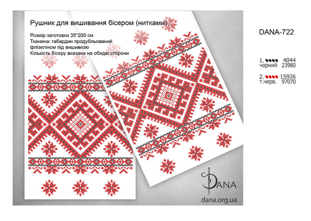Заготовки рушників під бісер або нитки. Розмір готового виробу 35*200 см. Матеріал габардин підклеєний двома шарами флізеліну під площею зашиття. Край по периметру оброблений оверлоком. Кількість бісеру зазначена загальна (на обидві сторони рушника)