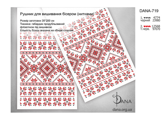 Заготовки рушників під бісер або нитки. Розмір готового виробу 35*200 см. Матеріал габардин підклеєний двома шарами флізеліну під площею зашиття. Край по периметру оброблений оверлоком. Кількість бісеру зазначена загальна (на обидві сторони рушника)