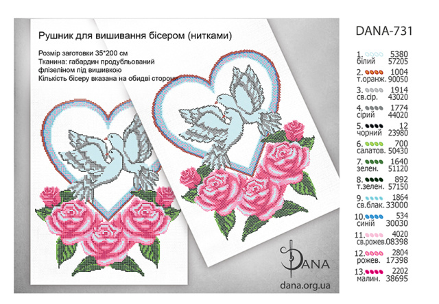 Заготовки рушників під бісер або нитки. Розмір готового виробу 35*200 см. Матеріал габардин підклеєний двома шарами флізеліну під площею зашиття. Край по периметру оброблений оверлоком. Кількість бісеру зазначена загальна (на обидві сторони рушника)