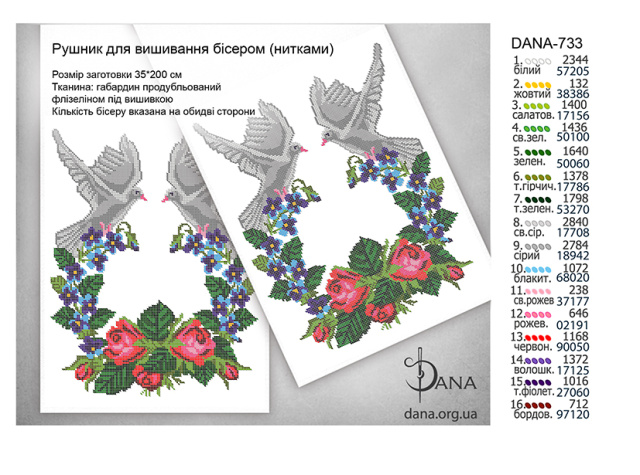 Заготовки рушників під бісер або нитки. Розмір готового виробу 35*200 см. Матеріал габардин підклеєний двома шарами флізеліну під площею зашиття. Край по периметру оброблений оверлоком. Кількість бісеру зазначена загальна (на обидві сторони рушника)