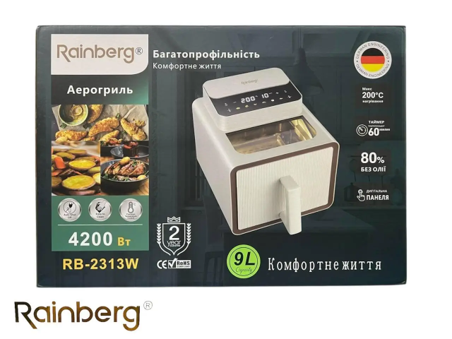 Фритюрниця Rainberg на 9 л ідеально підходить для сімей, які люблять смажену їжу, але хочуть скоротити кількість жирів та калорій. Ця модель робить ідеальні хрумкі креветки, неймовірно смачний стейк і чіпси здоровішою їжею і все це на 80% менше жиру!