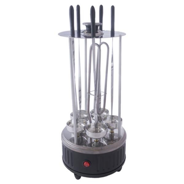 Електрошашличниця має циліндричну форму: у верхній частині розташована Жарова камера, у нижній – привід шампурів. Шість обертових шампурів із чашами для стікання жиру та захисний кожух забезпечують рівномірне обсмажування шашлику зі всіх боків.