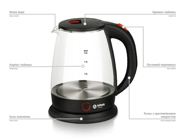 Чайник електричний скляний 2,0л 2400Вт BITEK BT-3113, Вінниця