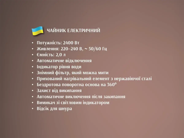 Автоматичне відключення: чайник вимикається, коли вода закипає, що запобігає перегріву.
