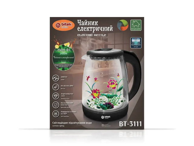Електрочайник скляний BITEK 1,8л 2400Вт з квіткою BT-3111