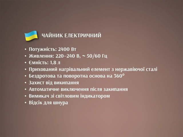 Для безпечного використання в чайнику передбачена функція захисту від сухого кипіння, яка автоматично відключає чайник, якщо в ньому немає води або якщо вода википіла, щоб запобігти перегріву та пошкодженню пристрою, а також вбудований захист від перегріву. Стильний сучасний дизайн чайника добре впишеться в інтер'єр будь-якої кухні чи офісу.