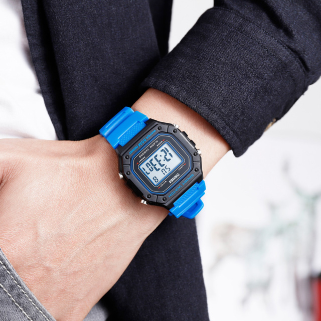 Годинник оснащений електронним циферблатом із яскравою електролюмінесцентною підсвіткою та має безліч функцій, таких як будильник, календар, другий часовий пояс і секундомір. Стильний чорний корпус в поєднанні з синім ремінцем створює сучасний вигляд, підходячи як для спорту, так і для повсякденного використання.