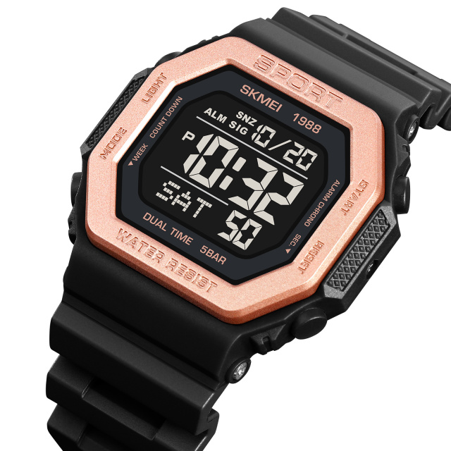 Годинники Skmei 1988RG Rose-Gold поєднують стиль і функціональність. Модель має водонепроникність до 50 м, що робить її ідеальною для активного способу життя. Корпус виготовлений з полімеру, а ремінець — з каучуку, що забезпечує комфорт при носінні. Спортивний стиль годинника підкреслюють чорний корпус з елементами рожевого золота.