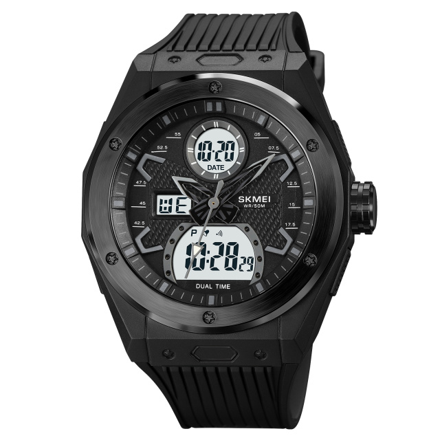 Годинник Skmei 2013BKWT Black-White — це ідеальне поєднання стилю та функціональності. Спортивний та casual дизайн підходить для будь-якого випадку. Водонепроникність до 50 м дозволяє носити годинник під час активного відпочинку. Корпус виготовлений з полімеру, ремінець з каучуку, що забезпечує комфорт і надійність. Годинник має кварцовий механізм та комбінований стрілочно-електронний циферблат з індикацією годин, хвилин, секунд і дати. Функції: будильник, календар, другий часовий пояс та секундомір. Електролюмінесцентна підсвітка стає в нагоді у темряві. Розміри 53 х 46 мм, вага 59 г. Гарантія 12 місяців. Виробник — Китай.