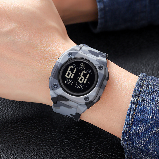 Skmei 2160CMGY Camo Grey – чоловічий спортивний годинник в стилі армія, виконаний у камуфляжному сірому кольорі. Корпус виготовлений з полімеру, а ремінець – з каучуку, що забезпечує комфорт під час носіння. Годинник має водонепроникність до 50 метрів, що дозволяє використовувати його під час занять водними видами спорту. Електронний механізм та електронний циферблат з арабськими цифрами забезпечують точність часу.