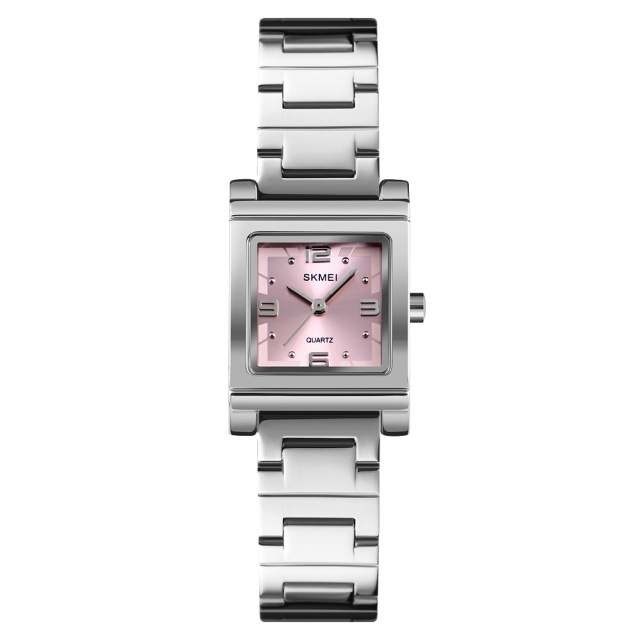 Годинник Skmei 1388PK Pink - стильний жіночий аксесуар, який поєднує класичний дизайн з сучасними технологіями. Корпус виготовлений з високоякісного металу сріблястого кольору, в той час як ремінець із нержавіючої сталі забезпечує комфорт та довговічність. Квадратна форма корпусу доповнює елегантний вигляд годинника, а мінеральне скло захищає циферблат від подряпин.