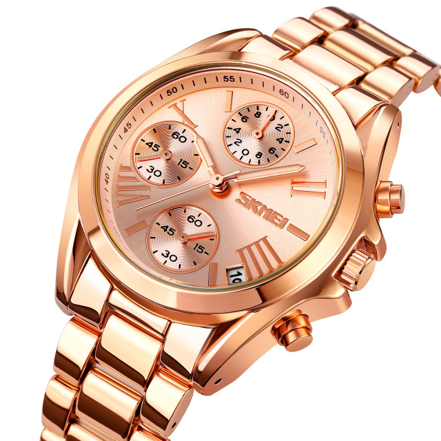 Годинник Skmei 1897RG у кольорі рожевого золота – елегантний аксесуар для жінок. Виготовлений з металевого корпусу та ремінця із нержавної сталі, цей кварцовий годинник поєднує стиль і функціональність. Мінеральне скло надійно захищає циферблат, що має стрілочний формат та індикацію годин, хвилин, секунд і числа. Годинник оснащений функціями календаря та хронографа, а також має водонепроникність до 30 м. Компактні розміри 43 х 39 мм та зручний браслет завершують його витончений вигляд. Гарантія на годинник становить 12 місяців.