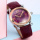 Годинник має круглий корпус діаметром 30 мм, виконаний з високоякісної сталі, з привабливим покриттям кольору рожевого золота. Фіолетовий шкіряний ремінець, довжиною 24 мм, додає йому витонченості та комфорту при носінні.