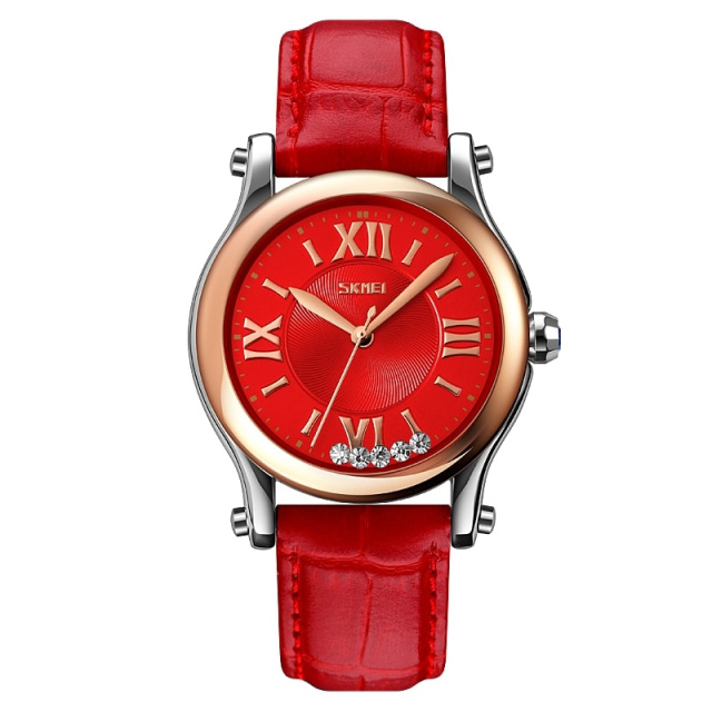 Годинник Skmei 9265RD Red — втілення елегантності та стилю для сучасної жінки. Цей розкішний аксесуар має круглий корпус з нержавіючої сталі рожевого золота, який доповнює червоний шкіряний ремінець. Час на годиннику відображається за допомогою стрілок та римських цифр, що додає класичного шарму.