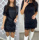 Наряд в стилі casual представлений в класичному темному кольорі. Модель має круглий виріз, рукави до ліктів і довжину трохи вище коліна. Вільна пряма форма виробу не щільно облягає фігуру, але все ж виставляє напоказ її переваги. На рукавах і внизу пришито гарне мереживо. Річ відмінно підійде для урочистого заходу або вечірнього виходу в світ.
