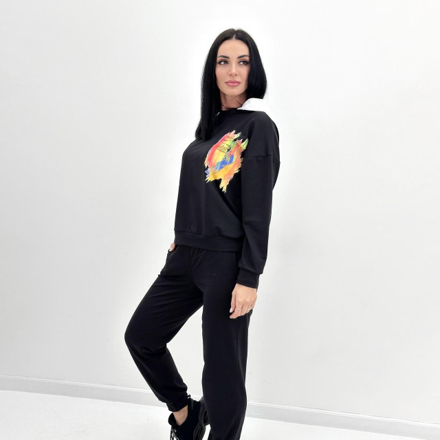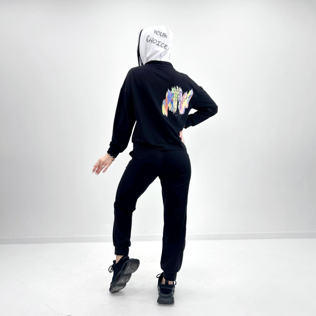 Комплект пошитий у трьох кольорах: ніжно-бежевому, базовому чорному та витонченому графіті. Кожен відтінок гармонійно поєднується з яскравими райдужними малюнками, не зволікаючи і підкреслюючи акценти.