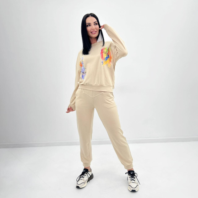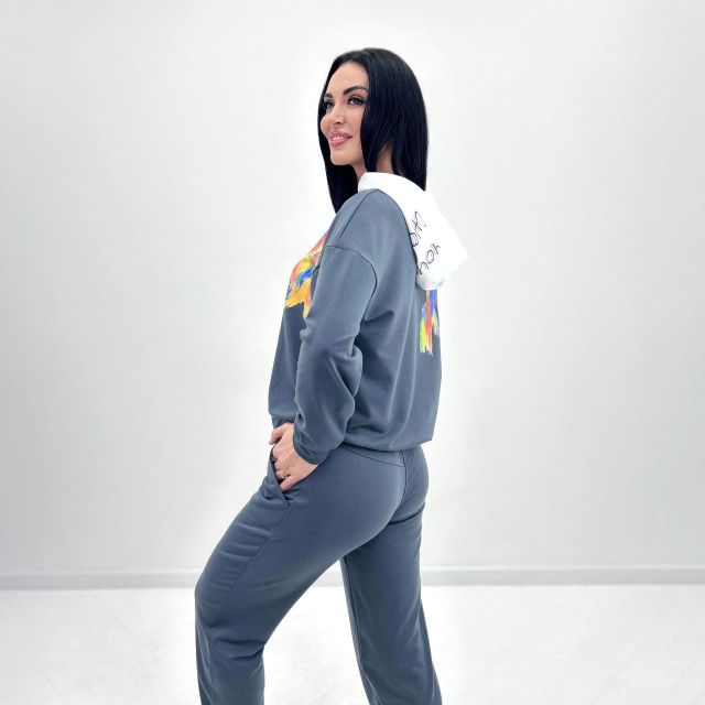 Головний особливість моделі - "Rainbow" - це вільний, але не безформний крій, базова палітра і кілька акцентних деталей: білий капюшон і яскраві принти на верхній частині костюма. Таке ефектне оформлення робить костюм ідеальним варіантом для прогулянкових та повсякденних чином.