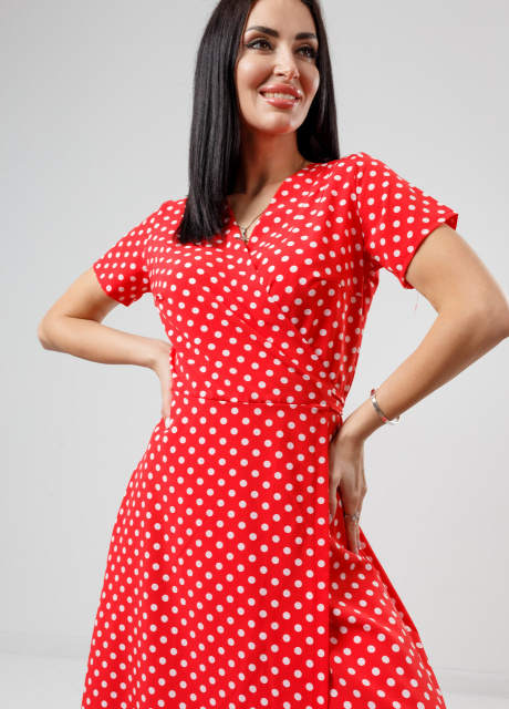 Модель з довжиною максі має глибокий V-подібний виріз на запах, короткий рукав і розкльошені нижню частину. Фіксується на талії поясочком. Виріб представлено в декількох варіантах кольорів і прикрашена принтом у вигляді дрібного горошку.