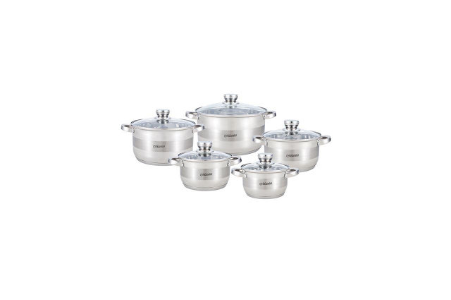 Набор посуды нержавеющей Maestro, 5 кастрюль объемом 1,5х2х3х5х6 л хороший вариант для домашней кухни. Такие емкости отличаются повышенной устойчивостью к ударам и царапинам. За счет плотного дна пища в них не подгорает, а уже готовые блюда сохраняют тепло минимум 35 минут. Особенно вкусными в нержавеющей посуде Maestro получаются супы, гарниры из круп и овощей. Защитного покрытия здесь нет, так что даже через 5 лет регулярного использования хозяюшкам не придется выводить ржавчину с металла. В отличие от алюминиевых кастрюль, емкости из нержавейки не образуют трещин, где обычно скапливаются микробы. К другим их преимуществам следует отнести простой уход и долговечность. Диаметр посуды 160х180х200х240х260 мм.