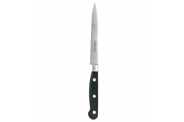 Нож кухонный Maestro это универсальный кухонный нож, лезвие которого изготовлено из высококачественной нержавеющей стали, которая отличается прочностью и долговечностью, не подвержена коррозии и воздействию кислот, отвечает всем гигиеническим нормам и требованиям, не влияет на вкус и проста в уходе.