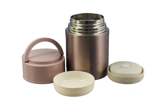 Термос для еды Maestro MR 1636-80 объёмом 800 мл выпускается в нержавеющем корпусе. Пиала и откручивающаяся крышка могут быть использованы в качестве тарелок. Удобные ручки, которые при необходимости загибаются и становятся частью крышки