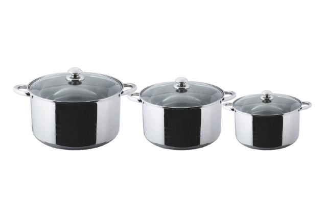 Набор посуды нержавеющей Empire, 3 кастрюли объемом 5х6,5х8 л – хороший вариант для домашней кухни. Такие емкости отличаются повышенной устойчивостью к ударам и царапинам. За счет плотного дна пища в них не подгорает, а уже готовые блюда сохраняют тепло минимум 35 минут. Особенно вкусными в посуде Empire разного диаметра получаются супы и гарниры. Защитного покрытия здесь нет, так что даже через 5 лет регулярного использования хозяюшкам не придется выводить ржавчину с металла. В отличие от алюминиевых кастрюль, емкости из нержавейки не образуют трещин, где обычно скапливаются микробы. В комплект входят стеклянные крышки, что в разы упрощает процесс приготовления блюд горячего цеха.