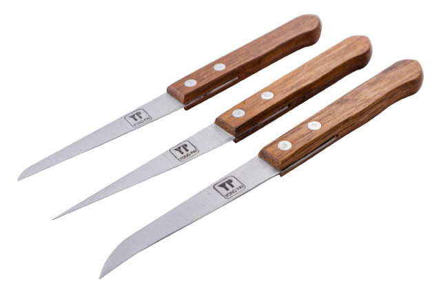 Набор ножей Empire длиной 180 мм понадобится для художественной резки по продуктам и не только. Так мастера создают оригинальные композиции из огурцов, картофеля, редиса или, например, твердой тыквы. Из фруктов для столь необычного искусства больше подходят яблоки, апельсины, кусочки дыни и авокадо. Чтобы продукты не темнели, их предварительно сбрызгивают лимонным соком. В наборе – 3 ножа с высокопрочными деревянными ручками. Длина лезвия – 70 мм. Ширина – 15 мм. Все инструменты выполнены из пищевой нержавейки с повышенной устойчивостью к корозии
