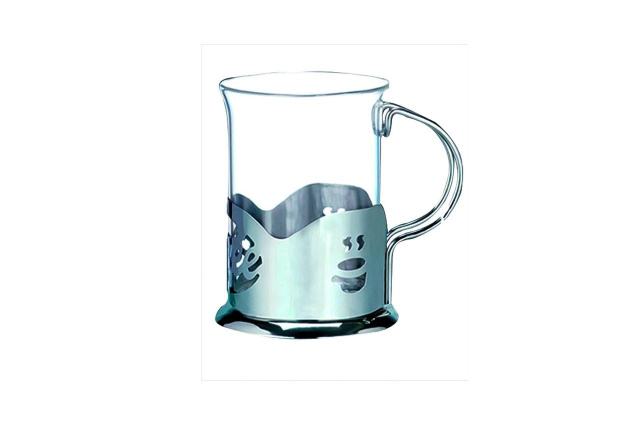 Тонкий стеклянный стакан объемом 200 мл в подстаканнике из пищевой нержавеющей стали.