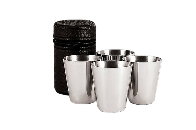 Рюмки металлические, снаружи полированные. Лучше всего использовать на природе. Устойчивы к разным ушибам и повреждениям. Хорошо моются в посудомоечной машине. Производные стопочки 6 штук по 60 мл изготовлены из коррозионно-стойкой стали. Упакован в кожаный футляр, закрывающийся на молнии. Рюмки укладываться друг в друга. Оптимальный размер стопочки.