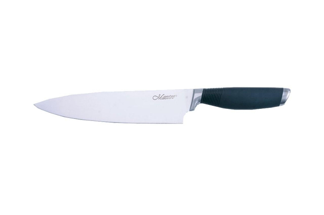 Maestro — это универсальный кухонный нож, лезвие которого изготовлено из высококачественной нержавеющей стали, которая отличается прочностью и долговечностью, не подвержена коррозии и воздействию кислот, соответствует всем гигиеничным нормам и требованиям, не влияет на вкус и проста в уходе.