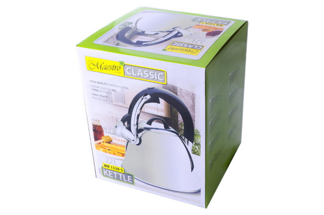Чайник нержавеющий Maestro - 2,2 л MR-1320-S изготовлен из высококачественной нержавеющей стали с глянцевой полировкой. Оснащен клапаном-свистком и