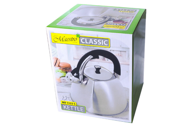 Чайник Maestro 2,2 л (MR-1333-S) – это чайник для плиты, изготовленный из высококачественной нержавеющей стали с комбинированной полировкой. Стальные изделия отличаются чрезвычайной прочностью и долговечностью, обладают высокими гигиеничными и антикоррозийными свойствами, а также не требуют особого ухода и легко моются. Оснащен не нагревающейся пластиковой ручкой. Благодаря насадке-свистку, с кнопкой для открывания на ручке, Вы точно будете знать о моменте закипания воды.