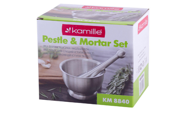 Стальная ступка Kamille понадобится для каждой хозяйки, которая любит радовать своих близких натуральной и вкусной едой. Ступка предназначена для растирания разных специй, трав и приготовления ароматных соусов и заправок. Не впитывает запахи и потому все специи приготовленные в ступке сохранят свои ароматы для ваших блюд и не смешаются с ароматами ранее приготовленных в ступке приправ.