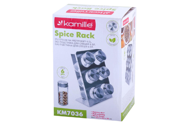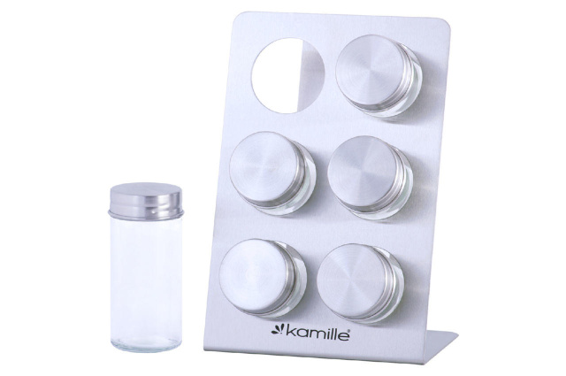 Набор емкостей для специй Kamille - состоит из 6 емкостей для специй объемом 100 мл на стойке, баночки изготовлены из стекла с завинчивающейся стальной крышкой. Удобно размещаются в два ряда (по 3 штуки в ряду) на стальной подставке.