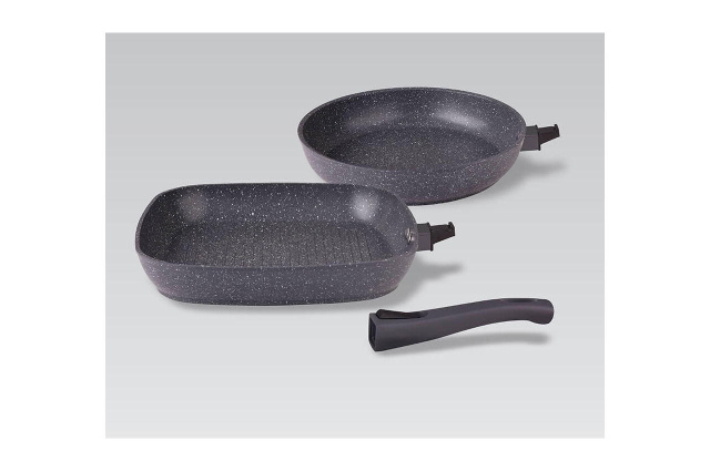 Набор сковородок Maestro MR 4800 состоит из 3х предметов: универсальная сковорода диаметром 24 см, сковорода-гриль 26х26 см, съемная ручка с фиксатором на кнопке. Корпус сковородок изготовлен из прочного литого алюминия, быстро и равномерно распределяющему тепло, в дно вставлен стальной антидеформационный диск, позволяющий использовать в качестве источника тепло на только классические газовые и электро плиты, но и индукцию. Внутри нанесено устойчивое к механическому воздействию гранитное антипригарное покрытие (Granite). Удобная съёмная ручка с фиксирующей кнопкой позволяет пользоваться сковородками как на плите так и в духовке.