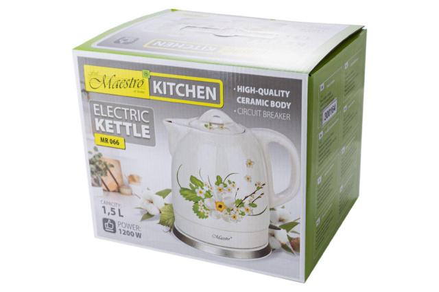 Электрочайник Maestro - MR-065 недорогая функциональная модель для дома. Показатель мощности в 1200 Вт не превышает возможности электросети, в отличие от более мощных моделей. Керамический корпус из экологически чистых материалов выдерживает высокие температуры. Объема в 1,5 литра хватит для чаепития небольшой семьи из 3-4 человек. Плоский нагревательный элемент, который скрыт под корпусом кипятит воду намного быстрее, чем модели с ТЭНами. Защита от перегрева сработает, если вы случайно забыли долить в прибор воды. Функция автоотключения обеспечит дополнительный комфорт от использования.