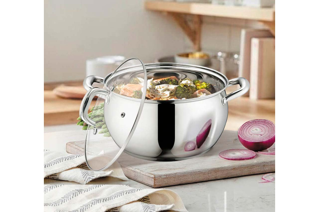Кастрюля Маестро MR-3515-22. Современный дизайн, блестящая полировка и красивые округлые ручки. Смотрится модно, современно и в то же время уютно. Благодаря округлому дизайну вмещает больше жидкости, чем аналогичные модели с прямыми стенками.