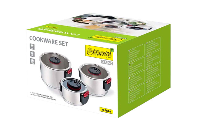 Набор нержавеющей посуды Maestro MR-3530-6. Диаметр: 16см, 20см, 24см. Объем: 1,5л, 3,2л, 5,8л. Высококачественная нержавеющая сталь. Многослойное термоаккумулирующее дно. Возможное использование на всех типах плит. Экологически чистые материалы.