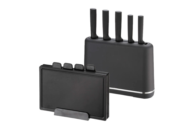 Набор ножей с досками Maestro – это стильный черный комплект из 5 острых ножей из нержавеющей стали (поварской, хлебный, универсальный, общего назначения и чистки овощей) и 4 компактных разделочных досок, удобно фиксируемых в эргономичной подставке для легкого хранения. Изготовлен из высококачественных материалов, обеспечивает безопасную нарезку без скольжения, долговечность лезвий и гигиеничность поверхностей, идеально подходя для ежедневной готовки. Этот универсальный набор придаст комфорт и эстетику вашей кухне, упрощая процессы от нарезки овощей до порционирования мяса.