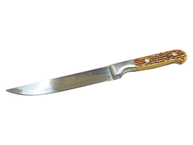 Универсальный кухонный нож, который можно использовать в процессе приготовления пищи. Он отлично справится с любой задачей на кухне. Обработка мяса, нарезка овощей и фруктов, хлебобулочных изделий – эти и другие задачи выполнит этот нож. Лезвие изготовлено из нержавеющей стали. Рукоятка крепкая, имеет оригинальный дизайн и выполнена под кость.