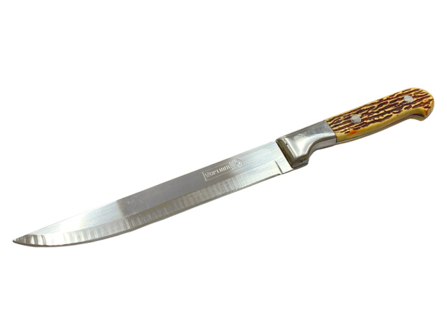 Универсальный кухонный нож, который можно использовать в процессе приготовления пищи. Он отлично справится с любой задачей на кухне. Обработка мяса, нарезка овощей и фруктов, хлебобулочных изделий – эти и другие задачи выполнит этот нож. Лезвие изготовлено из нержавеющей стали. Рукоятка крепкая, имеет оригинальный дизайн и выполнена под кость.