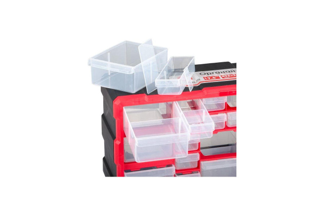 Органайзер выполнен из прочного пластика и вмещает в себя 22 лотка: 8 больших(140 х 110 х 60 мм), 14 маленьких (140 х 50 х 35 мм). Удобные ручки помогают выдвигать лотки, а ограничители на верхних стенках ячеек не позволяет им выпадать. Внутри каждого лотка размещается съемная перегородка, увеличивающая количество камер хранения до 44 шт. Прозрачные стенки упрощают процесс поиска. Органайзер предназначен для стационарного использования, вместительный и незанимает много места. Благодаря отверстиям расположенным на задней стенке, легко крепится на стену. Размер большого лотка: 140 х 110 х 60 мм; Количество секций: 22 шт; Габаритные размеры: 495 x 255 x 160 мм; Размер маленького лотка: 140 х 50 х 35 мм