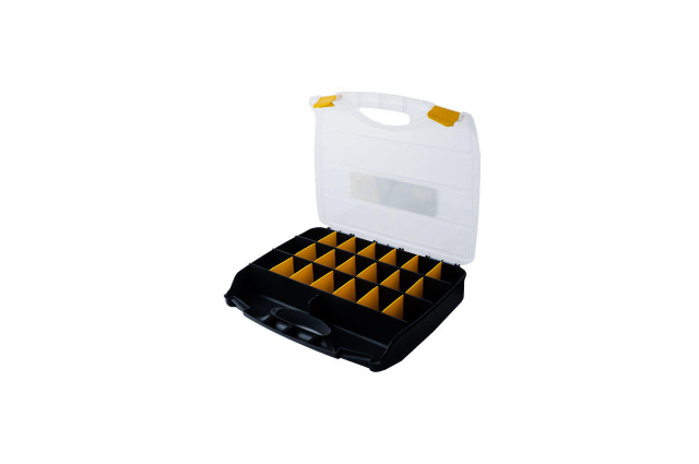 Предназначен для хранения крепежа, рыбалки, инструмента, дома, автомобиля, мелких предметов. Изготовлен из ударопрочного пластика. Габаритные размеры: 380 х 310 х 70 мм